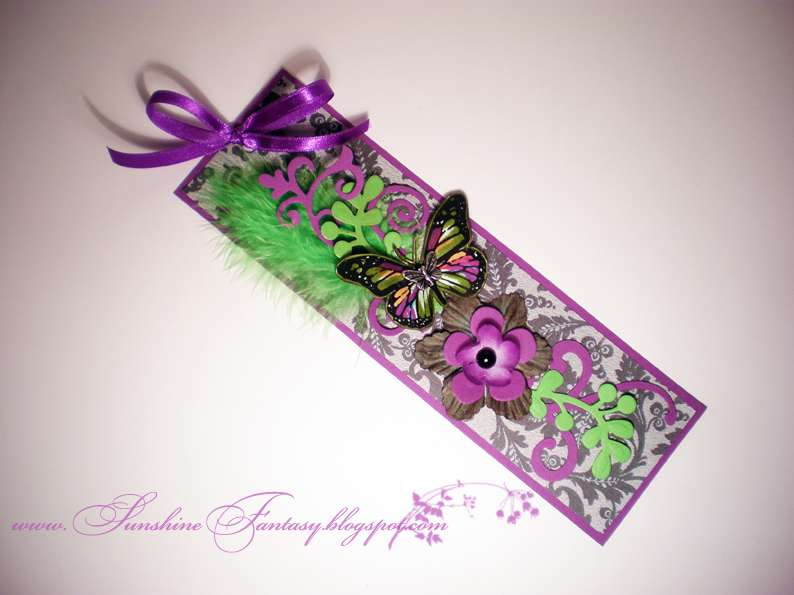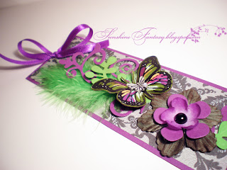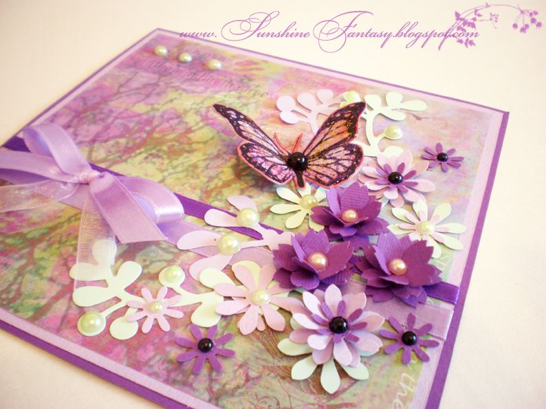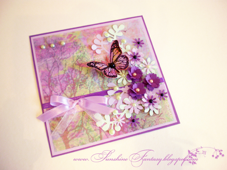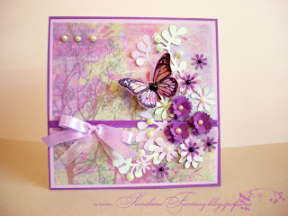 Една моя колежка наскоро се омъжи и ние от офиса и подготвихме подарък - изненада . На мен се падна задачата да го опаковам . Разполагах с интересна виолетова хартия и панделки /но за съжаление не успях да го заснема / . Заедно с подаръка реших да и направя картичка , на която да напишем пожеланията за бъдещия семеен живот ;) Ето и крайния резултат - букет виолетови цветя и кацнала пеперуда за разкош :)