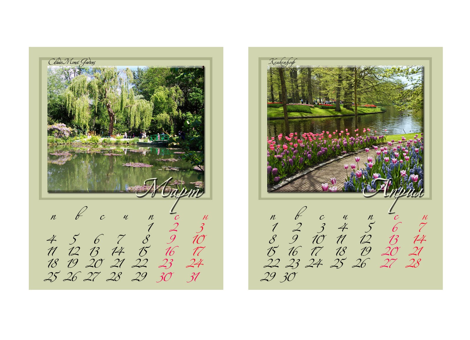 Хрумна ми да направя втори вариант на календара за 2013 година , този път с някой красиви Паркове и Градини . Отново съм комбинирала две по две картинките най-отдолу за по-лесно разпечатване върху по-плътни листи с формат А4 . Надявам се да ви хареса и този вариант : )