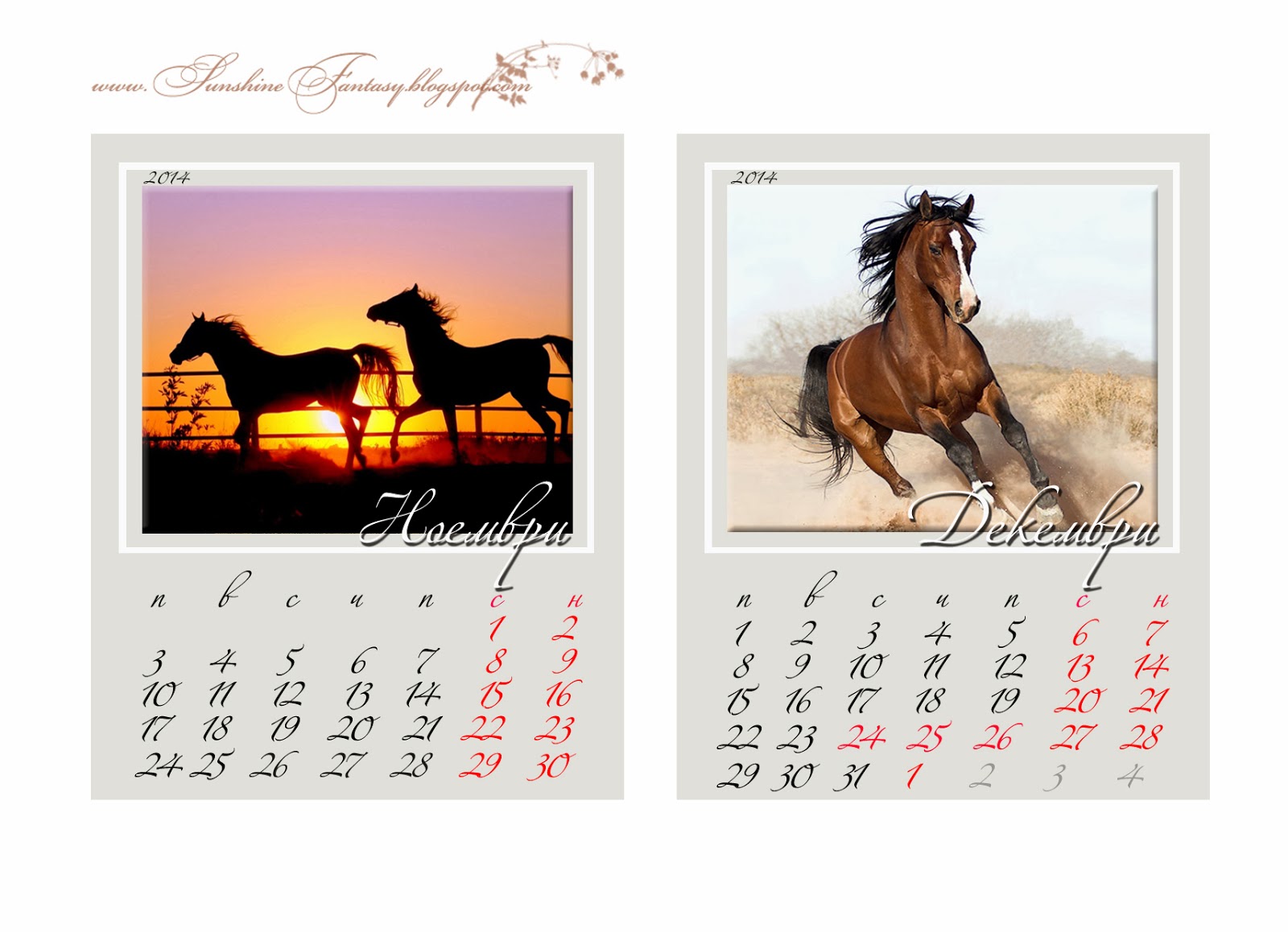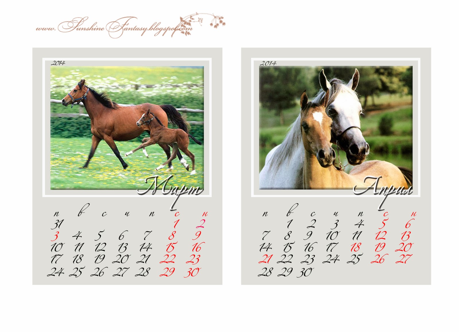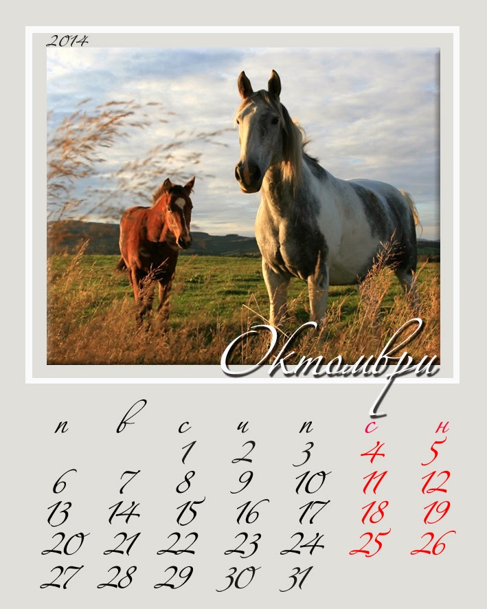 Най-сетне намерих малко време и много вдъхновение за да направя календар за 2014-та година . Избрах картинки с коне , от една страна защото на 31 януари настъпва Годината на Коня / по Китайския календар / , а от друга страна започнах много да харесвам конете покрай един мой приятел , който им е тотален фен и ги обожава !