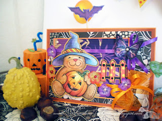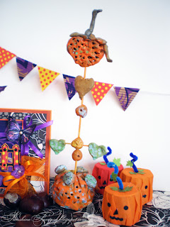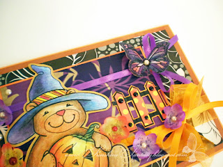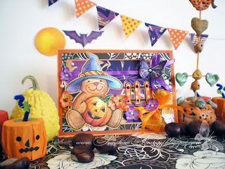 Мечето за картичката оцветих с акварелни моливи , а прилепа изрязах от виолетов картон и украсих с малко брокат . Пълната луна , която всъщност трябваше да е на фона на тъмно небе , но не е - изрязах от жълт картон и с помощта на дистрес мастило направих по-обемна . За глинената тиквена декорация ми помогна Сашко , а гирляндата от флагчета изрязах от цветни хартии в оранжево - жълто- лилави цветове .