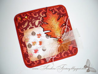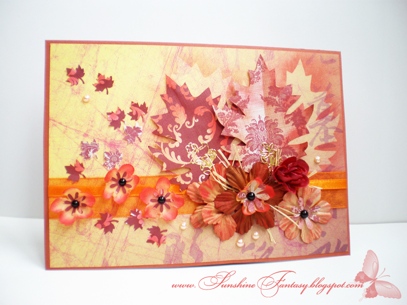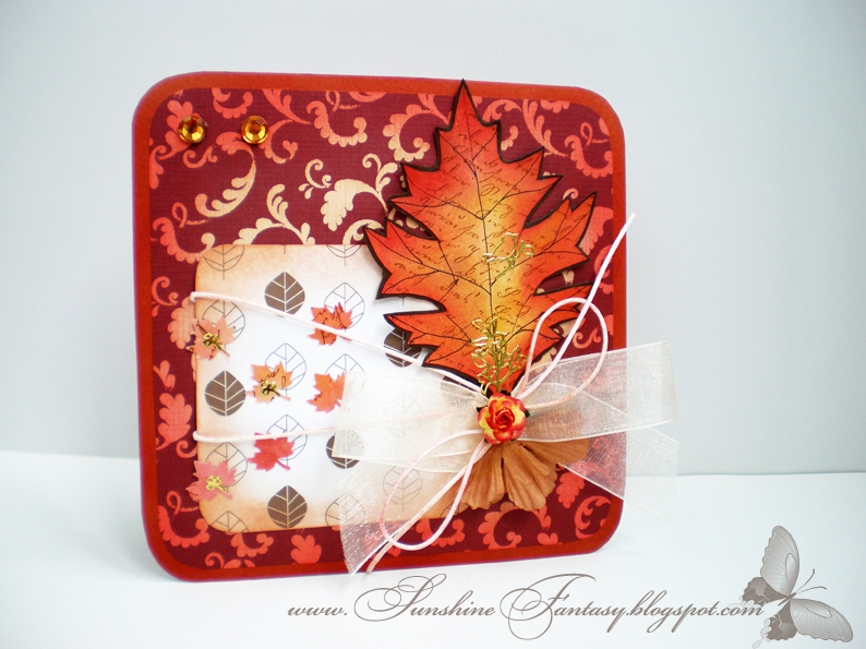 Златна есен , жълто - червено , оранжево - кафяви листа шумолят под краката ни . Навсякъде са изпопадали кестени ...Уж слънцето грее , а подухва леко хладен вятър ... ех , малко се отнесох в есенни размисли ;) И в този ред на мисли - ето това е картичката ми за предизвикателството на Двете Елши :