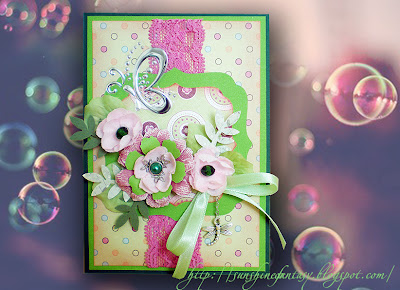 This time the card fulfills the conditions of several challenges that I want to include it . Styled like sketch-task and is mostly green shades. There are many flowers and fancy;) I used lace, stones, and even put a pendant - a dragonfly! I would be glad if you bring spring mood:)