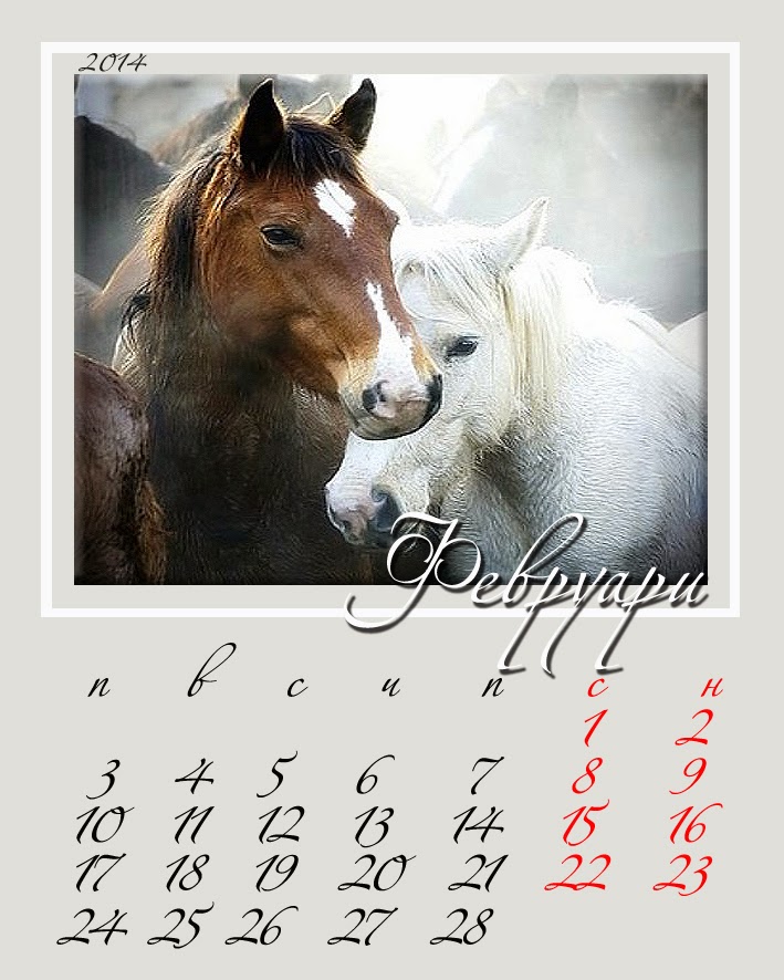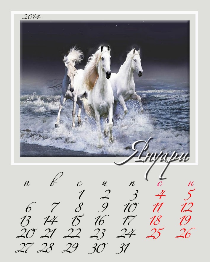 Най-сетне намерих малко време и много вдъхновение за да направя календар за 2014-та година . Избрах картинки с коне , от една страна защото на 31 януари настъпва Годината на Коня / по Китайския календар / , а от друга страна започнах много да харесвам конете покрай един мой приятел , който им е тотален фен и ги обожава !